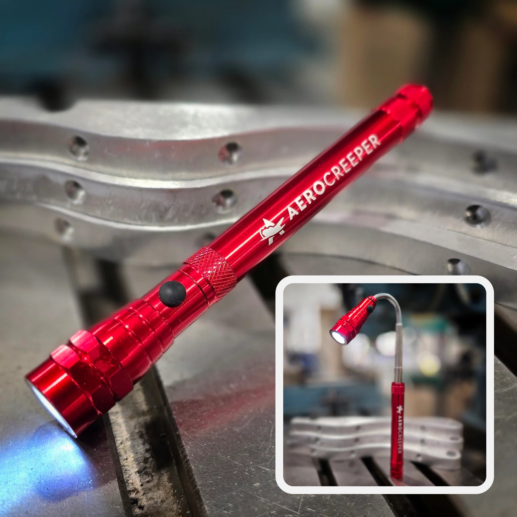 Built for tight spots and quick fixes, this compact flashlight extends for extra reach and flexes to aim light exactly where you need it. Three bright LEDs cut through low-light conditions, while magnetic ends let you work hands-free.. whether you're under the wing, the dash, or the bench. Finished in durable anodized coating* and machined from durable aluminum, it’s the kind of tool you’ll reach for again and again.