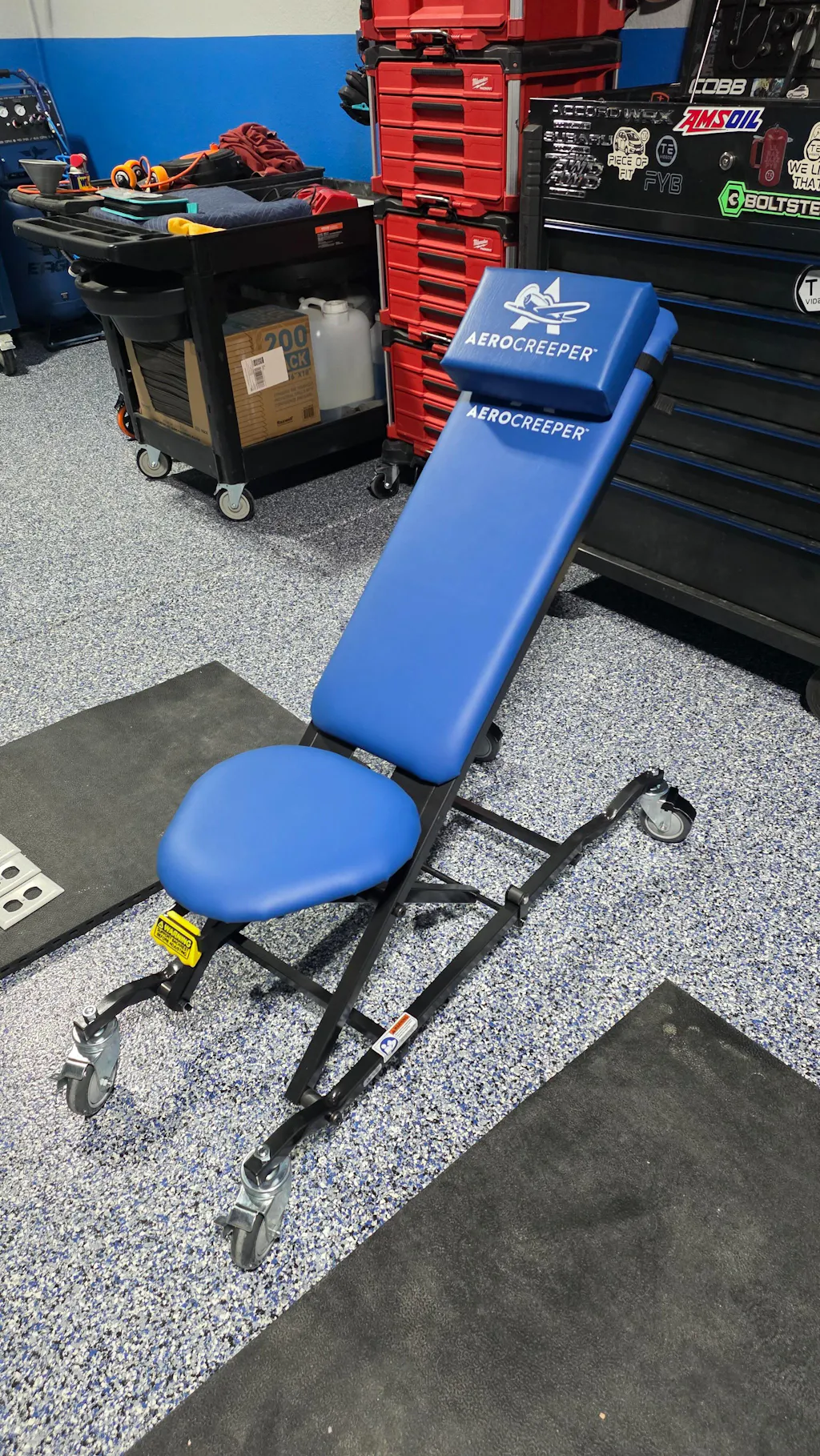 The Power-Lift™ 18V AeroCreeper operates with the commonly used 18-Volt Milwaukee tool battery. The linear screw actuator will take you from a seated position to a laying down position and all the way back up.